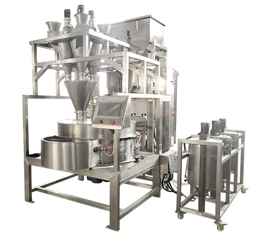 自動裹衣機適用于花生米、葵花籽、蠶豆、杏仁、腰果等產品的裹衣裹粉加工。 PLC自動化控制,原料、粉劑、料液自動補充,裹衣過程根據工藝改變添加參數及節奏,亦可根據粉劑種類的不同添加多個料筒,滿足了各類產品的工藝要求。密閉式結構,改善了傳統加工過程粉塵污染問題。一鍵式智能操作高度自動化,大大的減少了勞動強度和對工人裹衣技術的依賴;使裹衣質量、均勻度不在受人為因素影響;實現了一人多機,高產量高質量的自動化生產。